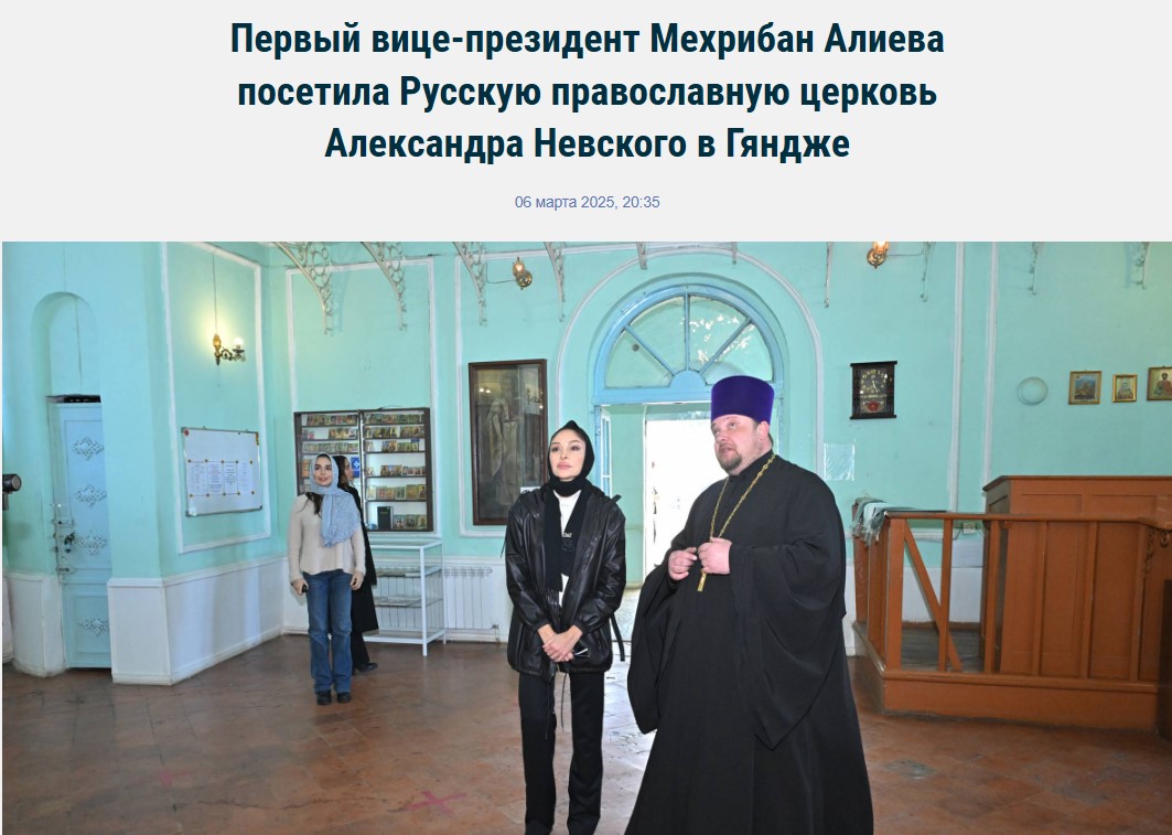 Ремонт Русской Православной церкви Святого Александра Невского в Гяндже в 2017 году, постоянное внимание государства к этой религиозной святыне, а также посещение этой церкви Первым вице-президентом, президентом Фонда Гейдара Алиева, Мехрибан ханым Алиевой и дочерьми Лейлой Алиевой и Арзу Алиевой в Гяндже являются примером высокого уважения к христианской религии.