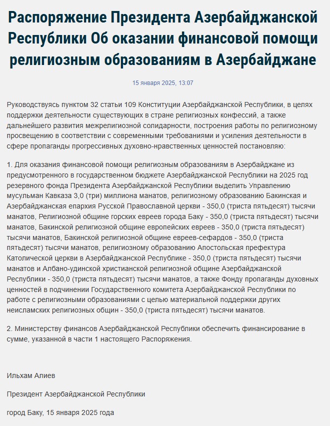 5) Согласно соответствующим указам Президента Азербайджана, каждый год из государственного бюджета выделяются значительные средства для поддержки деятельности религиозных конфессий в Азербайджане, а также для дальнейшего развития межрелигиозного согласия. Средства выделяются религиозным организациям, включая Русскую Православную Церковь в Баку и Азербайджанскую епархию, общину горских евреев города Баку, общину европейских евреев Баку, общину сефардских евреев Баку, религиозную организацию Апостольской префектуры Католической Церкви, а также Албано-Удинскую Христианскую Общину. Часть этих средств направляется на закупку соответствующих принадлежностей и ресурсов, чтобы христианские общины могли удобнее исполнять свои религиозные обряды, что также демонстрирует высокое доверие Азербайджанского государства к другим религиям.