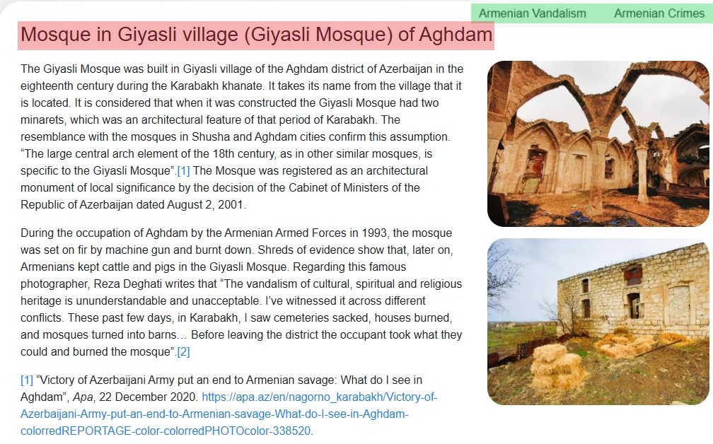 Но скрыть правду невозможно — сотни и тысячи материальных доказательств и исторических фактов говорят сами за себя. В отчете, подготовленном Министерством иностранных дел Азербайджана, акты вандализма, совершенные Арменией в отношении наших историко-культурных памятников, задокументированы и систематизированы с использованием фото- видеоматериалов, а также официальных документов.