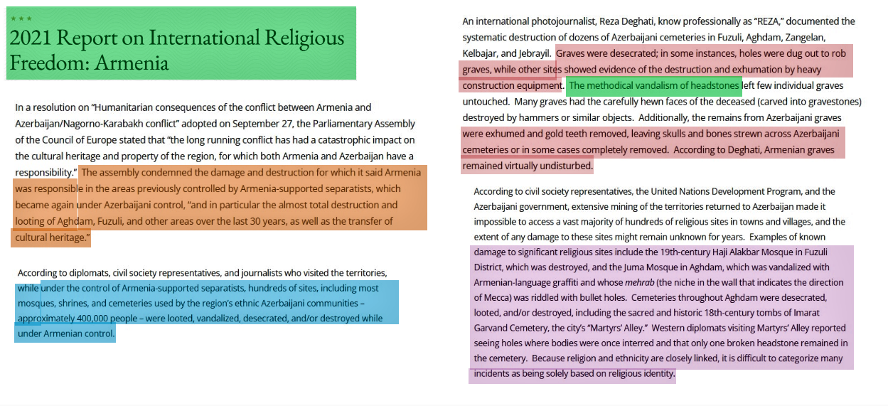 Кстати, в 2021 году Государственный департамент США в своем отчете о свободе вероисповедания в мире также отметил акты вандализма, совершенные армянами в период оккупации Азербайджана. В отчете говорится, что Армения полностью разрушила и разграбила культурно-исторические памятники на азербайджанских территориях, пытаясь изменить культурное наследие. Также указано, что на основе фото-доказательств и официальных документов, предоставленных дипломатами, представителями гражданского общества и журналистами, побывавшими на освобожденных территориях, за время оккупации армянами было разграблено и подвергнуто вандализму множество религиозных объектов, включая сотни мечетей, святых мест и кладбищ, принадлежащих примерно 400 тысячам азербайджанцев.