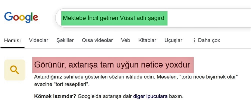 Наш комментарий: Утверждение о том, что ученик по имени Вусал якобы принёс в школу Библию и был за это избит другими школьниками — полностью вымышленное, не имеющее под собой никаких оснований. Подобного инцидента не происходило ни в одном учебном заведении Азербайджана, включая религиозные учреждения. Ни в социальных сетях, ни на других цифровых платформах нет никакой информации, подтверждающей этот случай. Ниже приведены результаты поиска в «Google» на азербайджанском языке: