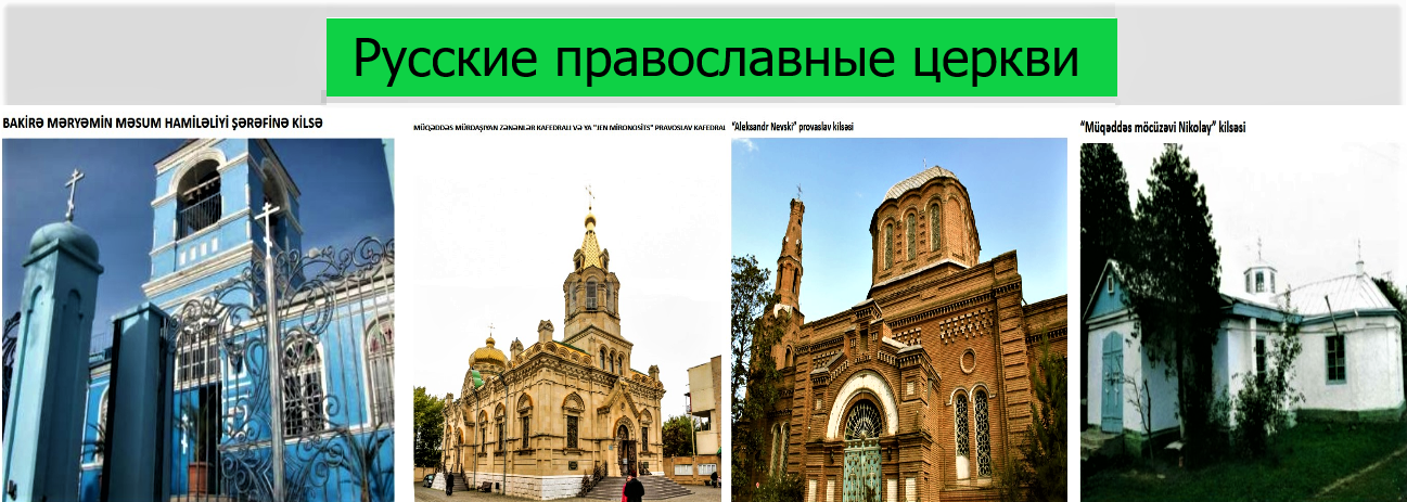 Православная церковь «Михаил-Архангел», относящаяся к христианству, была отреставрирована за счет государства. 25 мая 2001 года Московский и всея Руси патриарх Алексий II посетил церковь «Михаила-Архангела» и провел здесь молебен. Кафедральный собор «Святых Жён-Мироносиц» также охраняется государством. В этом храме, являющемся центром Баку и Азербайджанской епархии, удовлетворяются потребности верующих православного исповедания. Во время кровавых событий Января 1990 года на крышу храма упало два снаряда, однако здесь были проведены восстановительные работы. Патриарх Московский и всея Руси Алексий II объявил этот храм священным 27 мая 2001 года во время своего визита в Азербайджан.