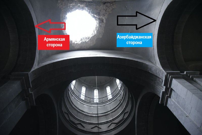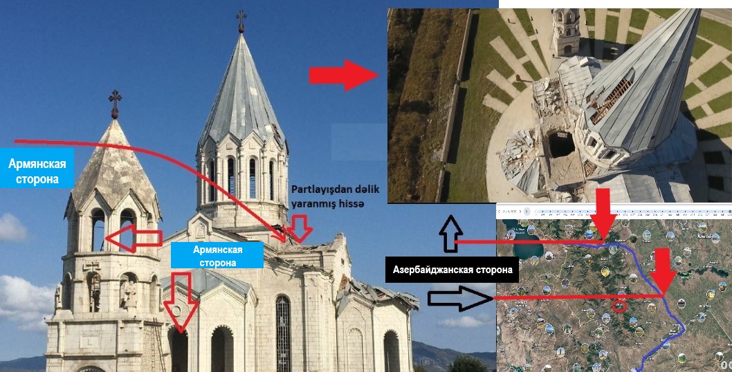 Эти фотографии были сделаны армянами после обстрела храма и распространены. Надпись «Азербайджанская сторона», сделанная на фотографиях, указывает лишь направление. Стоит отметить, что на тот момент расстояние до храма в Шуше составляло не менее 70-80 км."