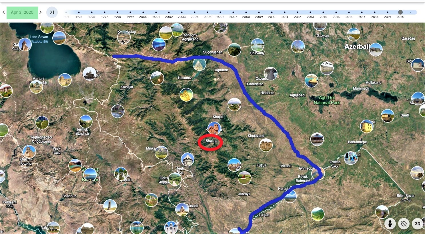 Ниже представлены скриншоты спутниковых изображений города Шуша и прилегающих территорий, сделанных 3 апреля 2020 года. (источник — «Google Earth»)