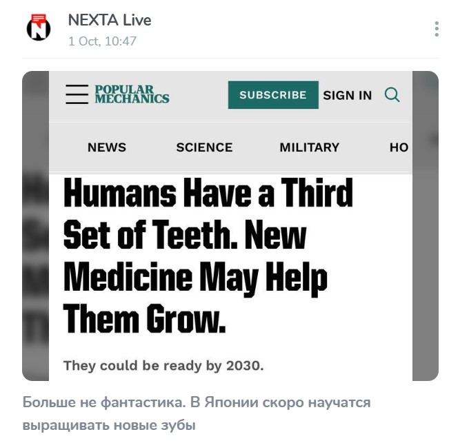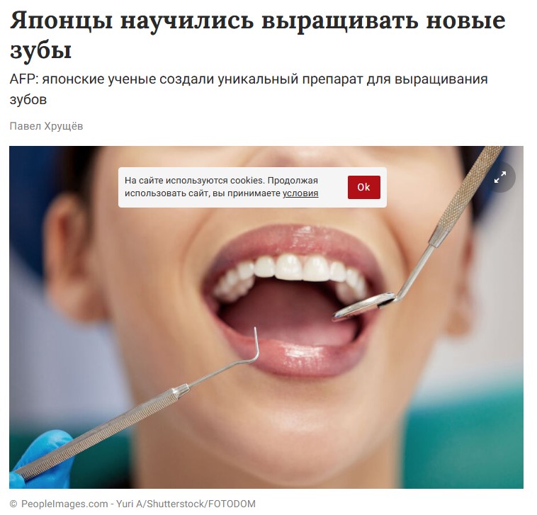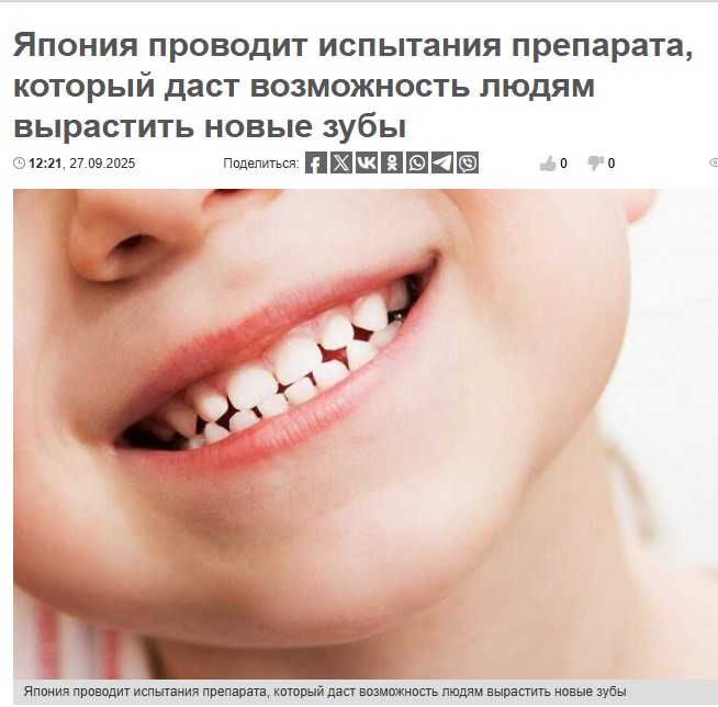 Новость о сенсационном прорыве японских учёных, который, предположительно, позволит людям выращивать новые зубы вместо того, чтобы ставить импланты, опубликовали «Фонтанка», Nexta и другие СМИ.