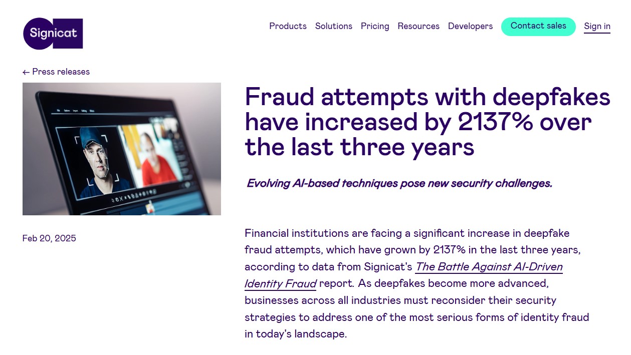 Согласно отчёту компании Signicat о мошенничестве с использованием ИИ для кражи личных данных, опубликованному в 2025 году, число попыток мошенничества с применением дипфейков в финансовом секторе выросло на 2137% за последние три года. Сегодня 42,5% попыток мошенничества в секторе связаны с использованием ИИ.