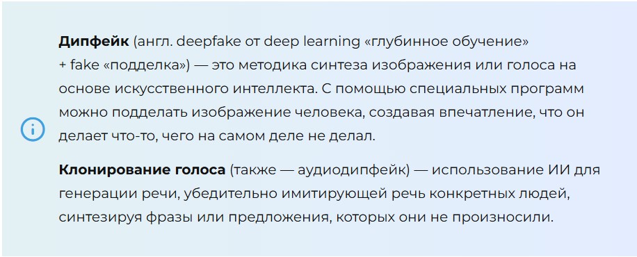 Злоумышленники используют технологию дипфейк на основе искусственного интеллекта для создания реалистичных поддельных видео, аудио или изображений, имитирующих других людей: это могут быть известные люди или даже члены семьи.