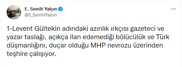 Onun sarf ettiği sözlere MHP Genel Başkan Yardımcısı, MHP İstanbul Milletvekili Semih Yalçın’dan cevap geldi. Yalçın attığı tweet’te Levent’ Gültekin adındaki azınlık ırkçısı gazeteci ve yazar taslağı, açıkça ilan edemediği bölücülük ve Türk düşmanlığını, duçar olduğu MHP nevrozu üzerinden teşhire çalışıyor – diyerek Gültekin’in gerçek yüzünü bir daha ortaya çıkardı.