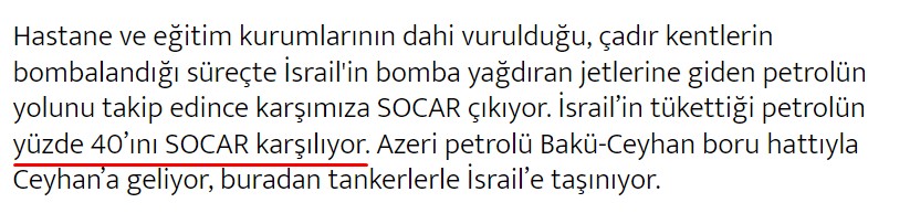 -SOCAR İsrail'e petrol satmıyor. Bu yalan ve asılsız bir haberdir. Dünya petrol piyasasındaki tüm şirketler mallarını ticaret şirketlerine satmaktadır. Tüccarların petrolü kime satmasıysa şirketleri ilgilendirmemektedir;