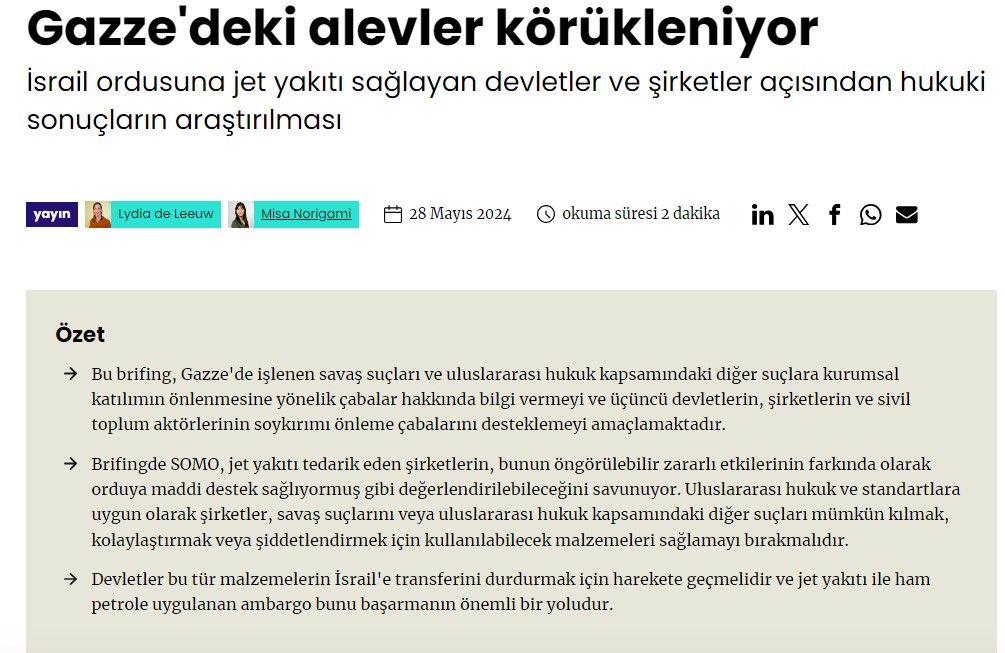 İsrail uçaklarına Azerbaycan petrolünden yakıt sağlandığı yönündeki 2. iddiaya gelince, Hollanda "SOMO" Araştırma Merkezi'nin 28 Mayıs 2024'te yayınladığı "Gazze'deki Alevler Körükleniyor" başlıklı yazıda geniş bir referans bulunduğunu belirtelim. Şöyle ki, makalenin yazarlarına göre Amerika Birleşik Devletleri (ABD), askeri jet yakıtı ('JP-8') dahil olmak üzere İsrail'in ana askeri yedek parça tedarikçisidir. ABD şirketi Valero, uzun süredir ABD hükümetiyle yapılan sözleşmeler kapsamında İsrail'in ana JP-8 tedarikçisi konumunda. "Valero" tarafından tedarik edilen "JP-8", Teksas'ın (ABD) Corpus Christi limanından "Overseas Shipholding Group" şirketine ait gemilerle Aşkelon (İsrail) limanına taşınmaktadır. Bu prosedür, nakliye şirketi ile İsrail hükümeti arasında yapılan bir anlaşma kapsamında yürütülmektedir.