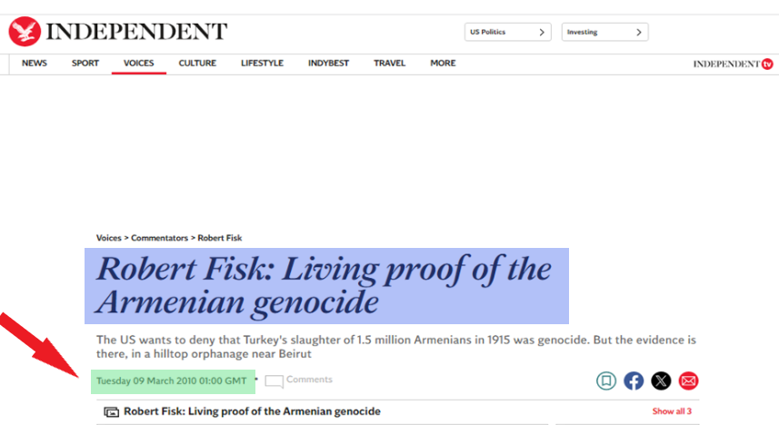 Öncelikle, bahsi geçen makalenin bundan 15 sene önce, 7 Mart 2010 yılında İngiltere'nin İndependent gazetesinde ''Robert Fisk: Living proof of the Armenian genocide'' (''Robert Fisk'in Ermeni soykırımının canlı kanıtı'') başlığıyla yayınlandığını anımsatmamız gerekiyor. Bir hususa da dikkat yetirmeliyiz ki, Robert Fisk bu makaleden üç sene önce de basında Ermeni soykırımının yeni kanıtları... isimli makale yayınlamış ve yazısına Ermeni Soykırımı Müzesi'nin müdürü Hayk Demoyan'ın şu sözleriyle başlamıştı: ''Türkiye inkâr politikasını sürdürse de, 20. asrın ilk 'Holokost'u olan Ermeni soykırımına dair her gün yeni kanıt bulunuyor. Ermeni Soykırımı Müzesi Müdürü Demoyan ise bu acının kaydının düşülmesi gerektiğini söylüyor ve şöyle devam ediyor: "Türk hükümetinin inkârı, atalarının yaptıklarından gurur duyduklarını gösteriyor" (kaynak)