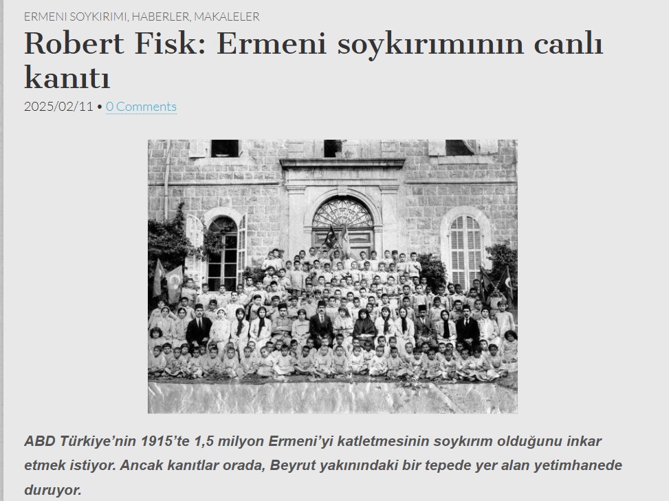 Geçtiğimiz günlerde akunq.net sitesinde The Guardian'ın 2020 yılında hayatını kaybeden tanınmış Yazarı Ortadoğu Uzmanı Robert Fisk'in Ermeni soykırımının canlı kanıtı isimli makalesi yayınlandı. “BD Türkiye’nin 1915’te 1,5 milyon Ermeni’yi katletmesinin soykırım olduğunu inkar etmek istiyor. Ancak kanıtlar orada, Beyrut yakınındaki bir tepede yer alan yetimhanede duruyor.” - diye başlayan makalede ''Ucuz betondan yapılma bir dikdörtgenle işaretlenmiş, sarı yaban zambakları ile donatılmış küçücük bir mezar''ın içinde yatanların ''1915 büyük soykırımının'' Ermeni yetimleri olduğu iddia ediliyor. Bunun dışında Fisk, "Şimdi ABD Kongresi'nin 1,5 milyon Ermeni'nin Osmanlı Türklerince katledilmesini soykırım olarak tanımasını engellemek için kampanya yapan Barack Obama ve bükülgen Dışişleri Bakanı Hillary Clinton, Lübnan'da bu tepedeki köye gelerek başlarını utançla eğmeli" ifadelerini kullandı.