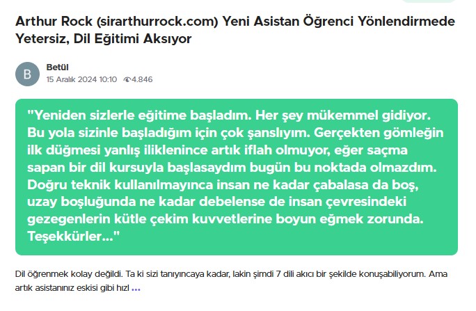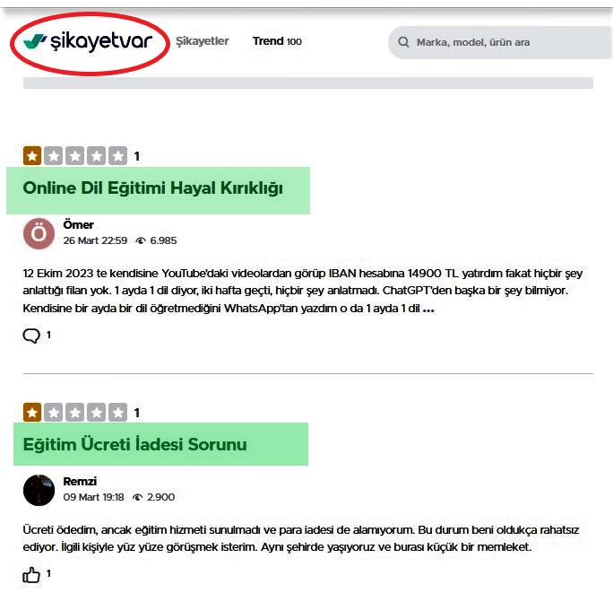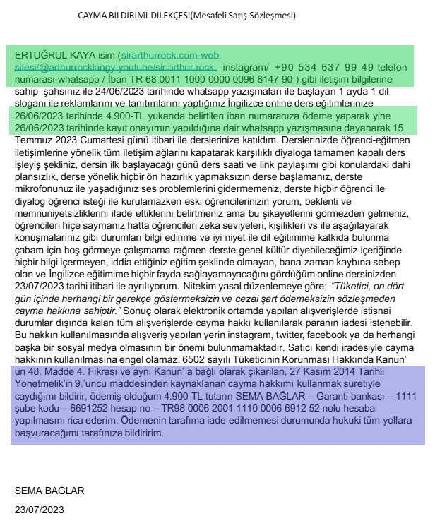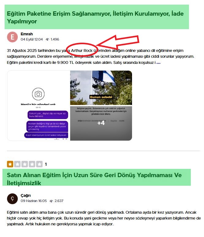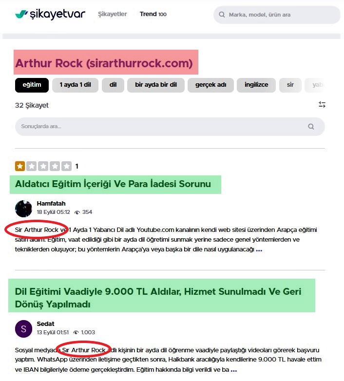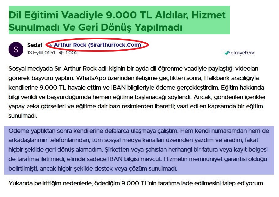 Soruşturma sırasında, bu kişinin "biraydabirdil" sloganıyla ayda 1 dil öğrettiğini iddia eden ve "Sir Arthur Rock" takma adıyla saklanan Ertuğrul Kaya olduğunu tespit ettik. "Arthur Rock" yazarak bu kişiyi Google üzerinden aradığımızda, Türkiye Cumhuriyeti vatandaşı Sema Bağlar tarafından 23 Haziran 2023 tarihinde yazılmış bir şikayet başvurusuyla karşılaştık. Başvuruda, Ertuğrul Kaya adlı kişinin web sitesi, @arthurrocklangy- youtube kanalı ve "Sirarthurrock" "Instagram" sayfası ve "+905346379949" telefon numarasıyla iletişime geçilerek, TR68 0011 1000 0000 0096 8147 90 numaralı banka hesabına 4900 TL transfer edildiği belirtilmekteydi.