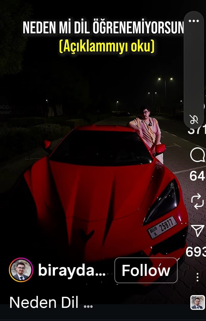 Videolarında sürekli zengin olduğunu, 20 dil bildiğini ve pahalı restoranlarda yemek yediğini söyleyen Ertuğrul Kaya'nın Dubai'deki faaliyetlerini araştırırken ilginç bir nokta dikkatimizi çekti. Şöyle ki, "1ayda1dil" ve "1aydazengin" hesaplarında sık sık kırmızı lüks bir arabanın önünde video çeken Ertuğrul Kaya, bu arabayı kendi helal emeğiyle satın aldığını iddia etmişti.