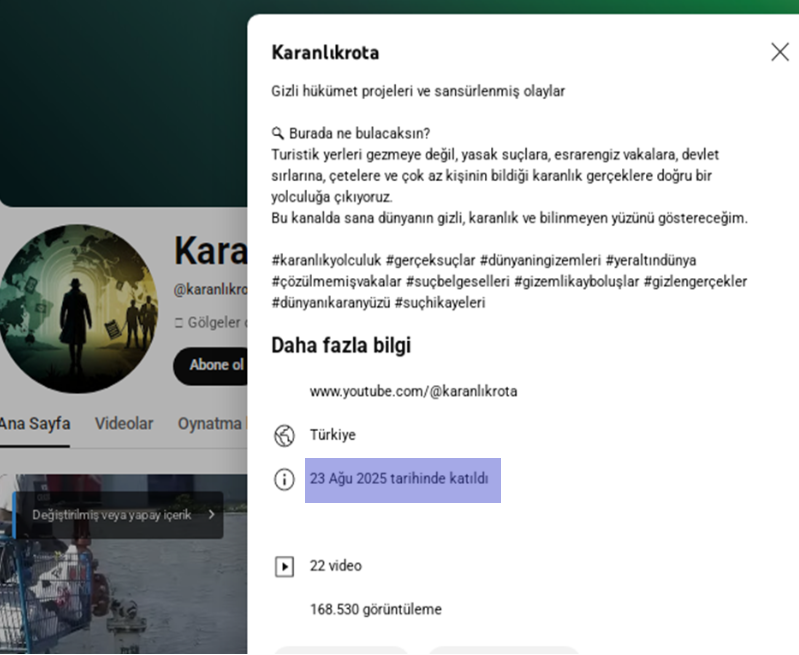 Kanalın araştırma için bağlı olduğu herhangi bir "facebook", "X" veya "LinkedIN" sayfasını bulmak mümkün olmadı. Fakat kanalın bilgi bölümünü incelediğimizde, kanalın 23 Ağustos 2025 tarihinde açıldığını görüyoruz.