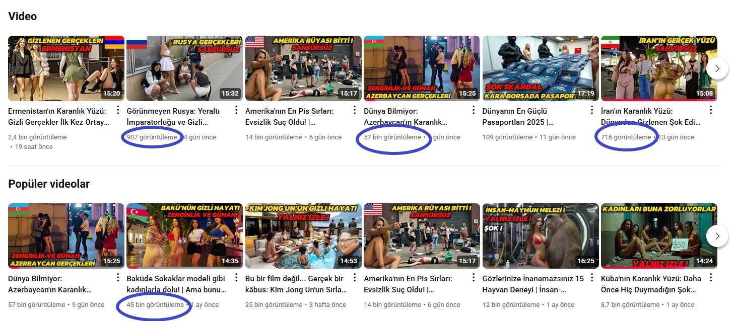 Okan Suvari'nin maskesini değiştirerek çektiği bu video, başından sonuna kadar sahte, asılsız ve mantıksız cümlelerle ve görüntülerle dolu. Daha önce yaptığı videlarda olduğu gibi, Ermeni kökenli bu kişi hem kanalının reklamını yapıyor hem de Azerbaycan hakkında videolar çekerek Azerbaycan karşıtı propaganda yürütüyor. Aşağıdaki ekran görüntüsüne dikkat edelim. Rusya hakkındaki video yalnızca 907, İran hakkındaki video ise yalnızca 716 kez izlenirken, Azerbaycan hakkındaki videolar (sözde kapak fotoğrafları da ayrı bir tartışma konusu - ed.) sırasıyla 57 bin ve 45 bin kez izlendi.