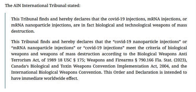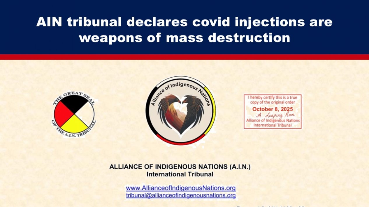 Araştırmalarımız sırasında 8 Ekim'de, Yerli Milletler İttifakı ("AIN") isimli sivil toplum örgütünün COVID enjeksiyonlarının uluslararası hukuka göre biyolojik ve teknolojik kitle imha silahları olduğunu belirten bir bildiri yayınladığını belirledik. Bu bildiri, enjeksiyonların ABD Biyolojik Silahlar Terörle Mücadele Yasası, Florida yasaları, Kanada Biyolojik ve Toksin Silahlar Sözleşmesi Uygulama Yasası ve Uluslararası Biyolojik Silahlar Sözleşmesi kapsamındaki kitle imha silahları kriterlerini karşıladığı bulgularına dayanmaktadır.