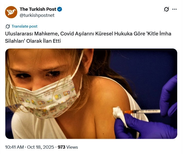Geçtiğimiz günlerde The Turkish Post isimli X hesabı ‘Uluslararası Mahkeme, Covid Aşılarını Küresel Hukuka Göre 'Kitle İmha Silahları' Olarak İlan Etti’ şeklinde bir haber paylaştı.