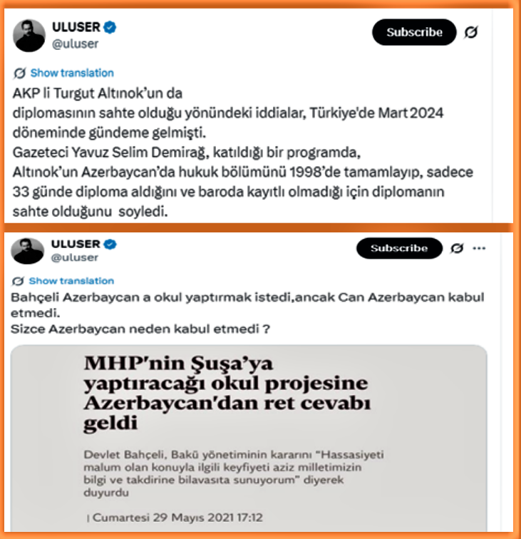 Örneğin, Keçiören eski belediye başkanı Turgut Altınok'un Azerbaycan'dan sahte diploma almasıyla ilgili spekülasyonları, MHP'nin Şuşa'da okul yaptıracağıyla ilgili çıkan söylentileri kendi X hesabına taşıması bu söylediklerimizi kanıtlamaktadır. Kimi zaman da "muhaliflik yapacağım" diyerek gerçekleri çarpıtıyor.