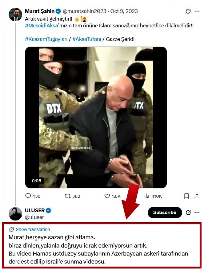Örneğin, Azerbaycan Devlet Güvenlik Servisi'nin sözde Karabağ Cumhuriyeti "yetkililerine" yapmış olduğu operasyonu bile "Azerbaycan Hamas'ın üstdüzey subaylarını derdest edilerek İsrail'e teslim etti" şeklinde paylaşıyor. Oysa, bilenler biliyor ki, bu görüntülerin İsraille hiç bir ilgisi yok.