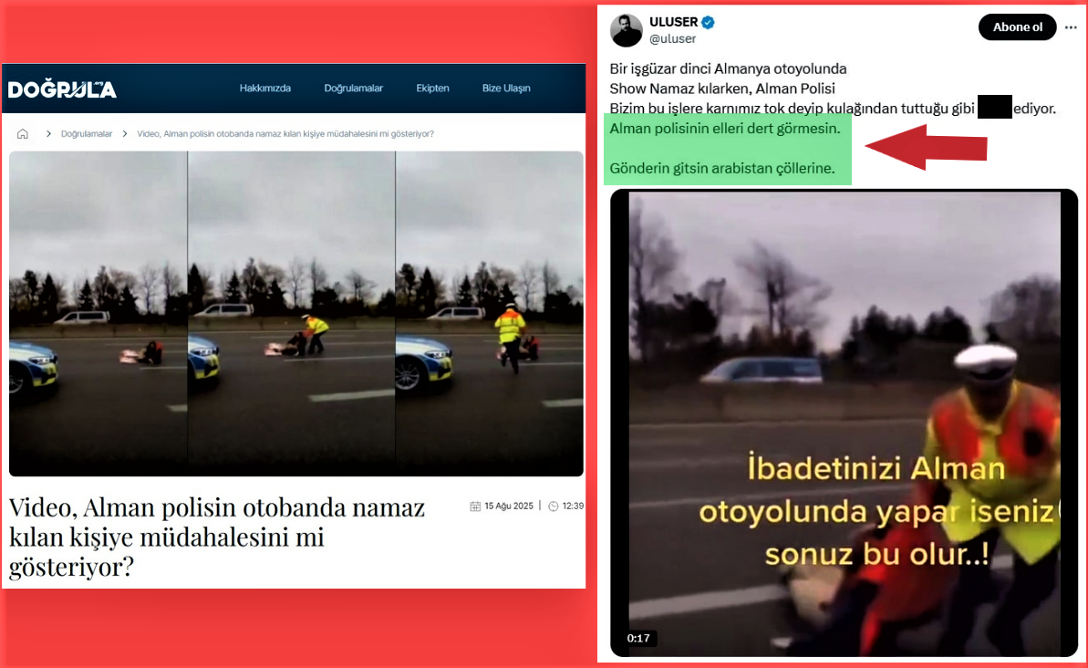 Bunun dışında "Uluser" isimli X hesabı geçtiğimiz aylarda Bir şahsın Almanya otoyolunda namaz kılarken, alman polisinin ona müdahele etmesiyle ilgili bir video paylaşmış dogrula.org sitesi söz konusu iddiayı araştırmıştı.