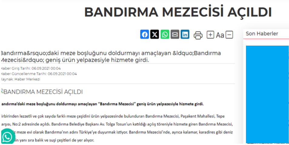 "Bandırma mezeevi" kelimelerini internette arattığımızdaysa karşımıza 2021 yılına ait marmarayasam.com sitesinde yayınlanmış olan "Bandırma mezecisi açıldı" başlıklı haber çıktı.