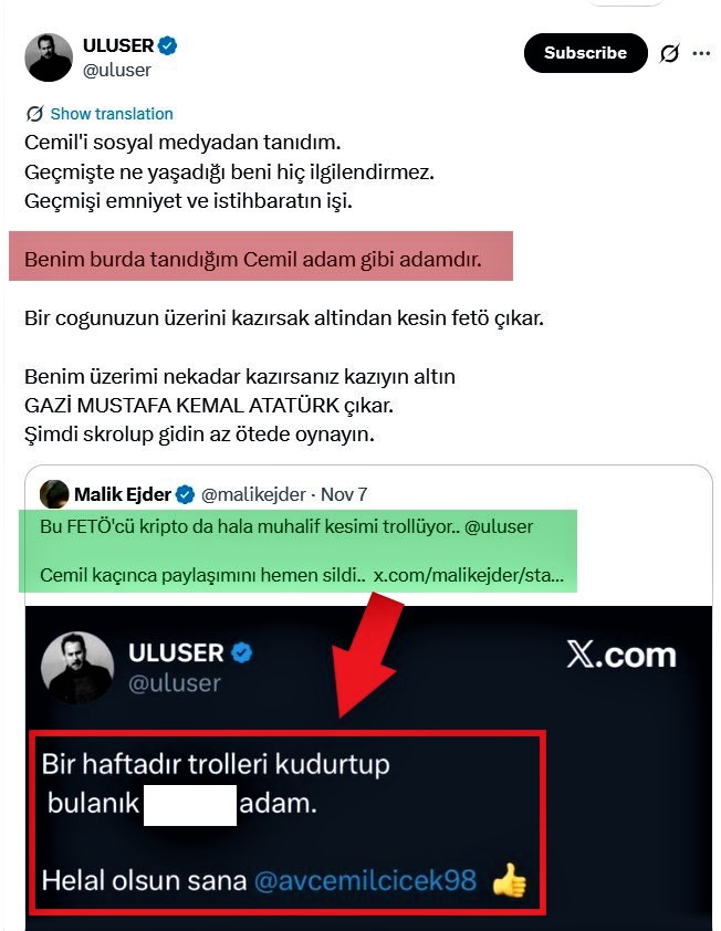 - FETÖ ile bağlantısı olan ve bu yüzden hesabına Türkiye’de erişim yasağı getirilen avukat Cemil Çiçeğ’i de savunduğu ve aynı zamanda FETÖ ile ilgili paylaşım yapan hesaplara da saldırdığı gözümüzden kaçmadı.