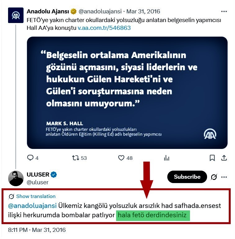 Ama ne gariptir ki, Ahmet Rıfat Aloğlu FETÖ ile ilgili yazı yayınlayan Anadolu Ajansı'na yorum olarak şunu yazmıştı: "Anadoluajansi ülkemiz kangölü yolsuzluk arsızlık had safhada.ensest ilişki herkurumda bombalar patlıyor hala fetö derdindesiniz..."