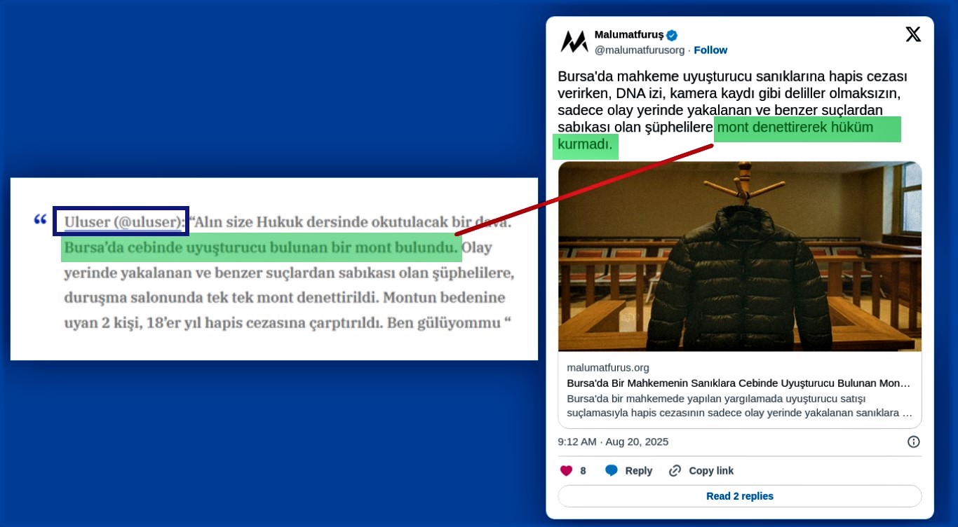Burda bir hususa dikkat çekmek istiyoruz: Uluser isimli kullanıcının paylaşımları sık sık Türkiye'de teyit sitelerinin gündeme oturdu ve hep yalanlandı. Örneğin, "Bursada bir Mahkemenin sanıklara cebinde uyuşturucu bulunan montu denettirerek hapis cezası verdiği iddiası" başlıklı yazıda "Uluser" isimli X hesabının da paylaşımına değinilmişti.