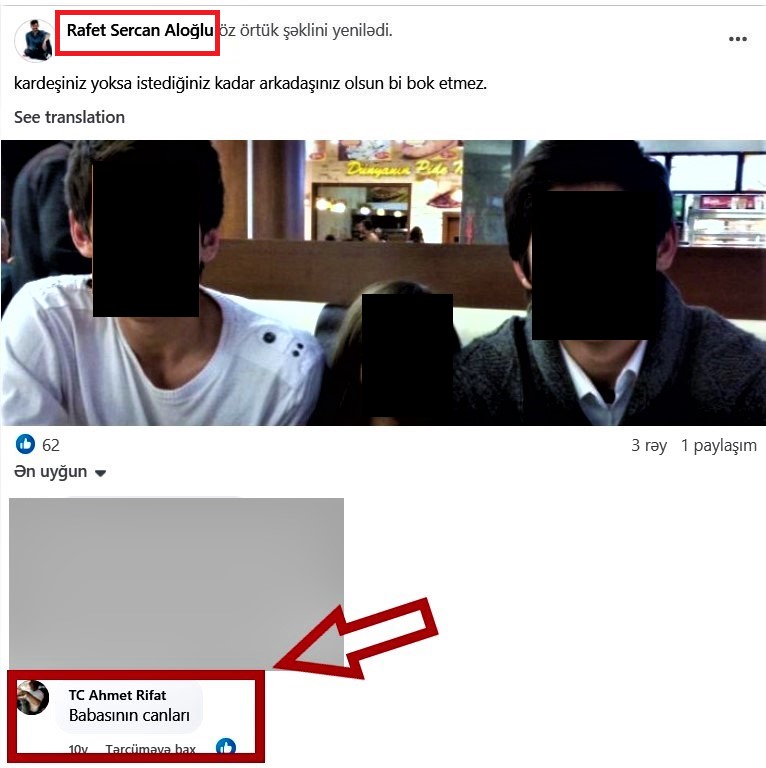 İnternette arattığımız zaman Rafet Sercan Aloğlu isimli Facebook kullanıcısının bir paylaşımıyla karşılaştık. Yorumlardaysa Tc.Ahmet Rifat isimli kullanıcının yapmış olduğu "Babasının canları" şeklinde bir yorumu vardı.
