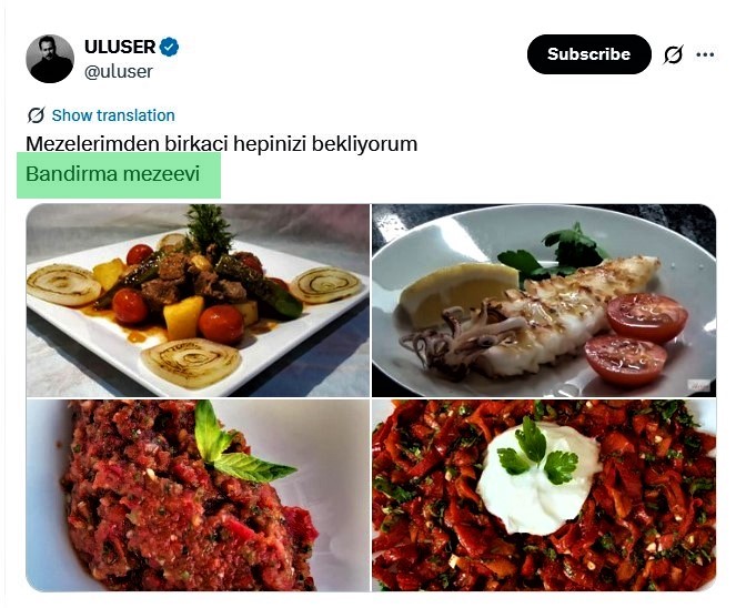 Araştırmalarımızı sürdürürken, onun bir paylaşımı dikkatimizi çekti: "Mezelerimden birkaci hepinizi bekliyorum. Bandirma mezeevi".