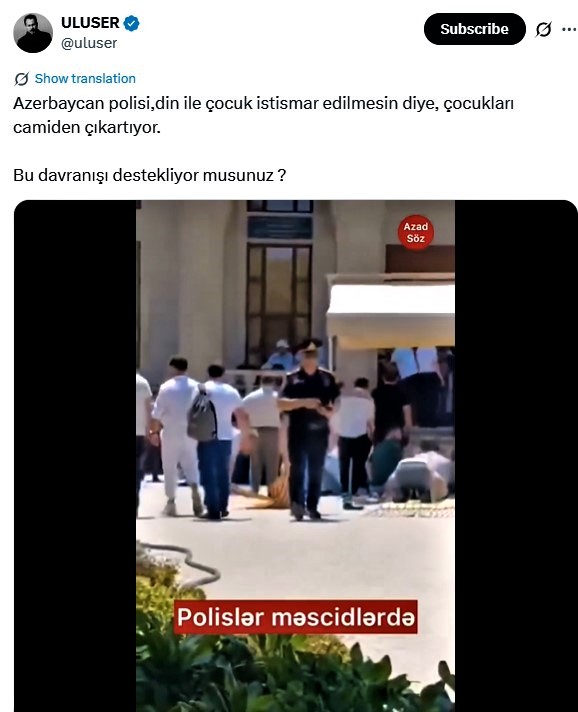 Geçtiğimiz günlerde @Uluser isimli kullanıcı kendi X hesabında Azerbaycanla ilgili şunları paylaştı: "Azerbaycan polisi, din ile çocuk istismar edilmesin diye, çocukları camiden çıkartıyor. Bu davranışı destekliyor musunuz?"