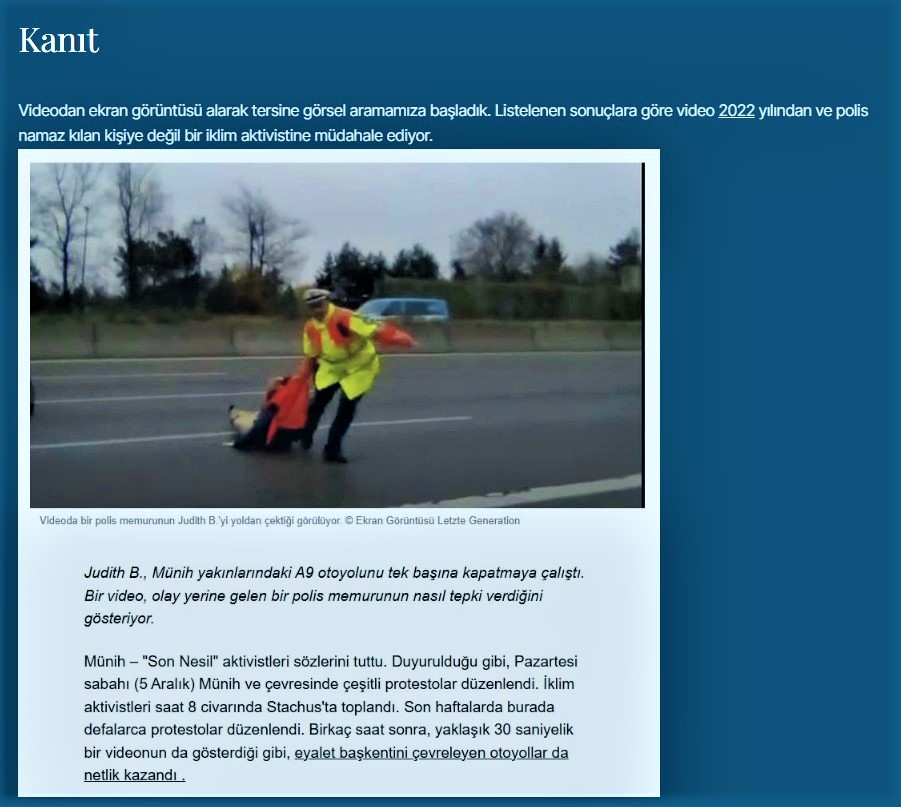 Tersine görsel aramasıyla yapılan incelemede videonun ibadetle bir alakasının olmadığı, haberin 2022 yılının Aralık ayında Almanya'nın Munich kentinde iklim aktivisti Judith B.'nin tek başına yaptığı eylemden aktarıldığını saptamıştı.