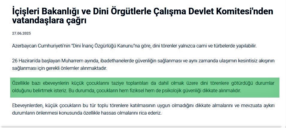Azerbaycan devleti de çocukların istikbalini düşünüyor ve haliyle çocukların küçük yaşta ibadet yerlerine götürülmesini tavsiye etmiyor.