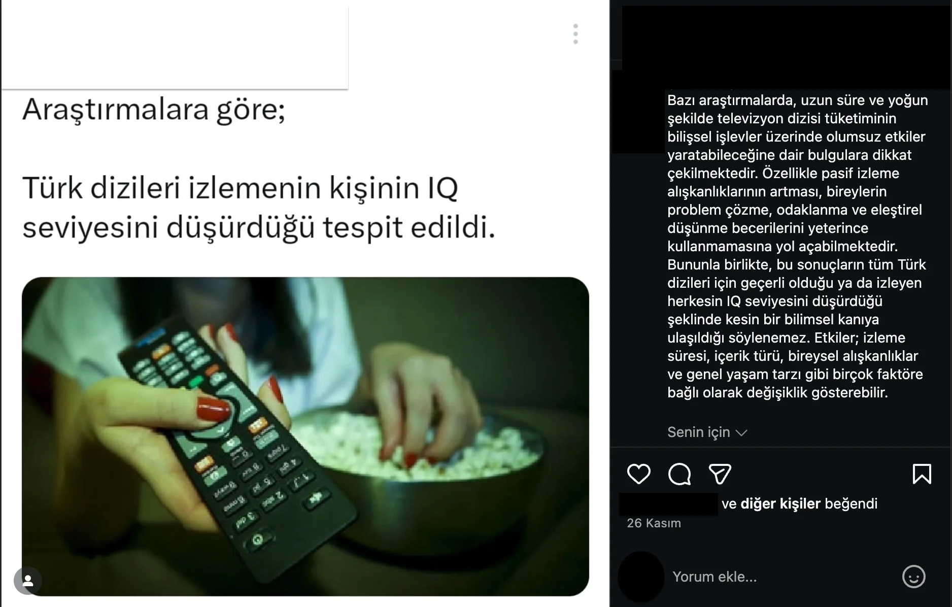 Sosyal medyada paylaşılan bir iddiada araştırmalara göre, Türk dizisi izlemenin IQ seviyesini düşürdüğü iddia edildi.