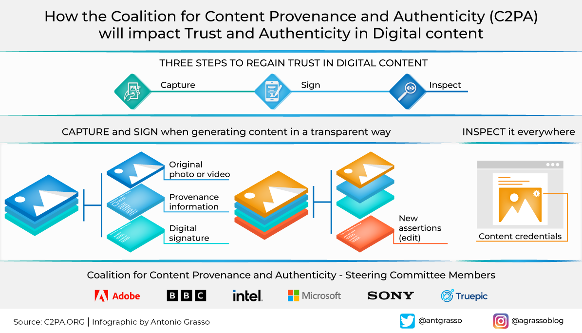 Bu alandaki en önemli girişim C2PA standardı. "Coalition for Content Provenance and Authenticity" ifadesinin kısaltması olan C2PA, Adobe, Microsoft, BBC, Intel gibi şirketlerin bir araya gelerek oluşturduğu bir teknik standart. Sistem, içeriklere bir tür "dijital kimlik kartı" eklemeyi hedefliyor. Bu kimlik kartı, içeriğin orijinal kaynağını, oluşturulma tarihini ve varsa yapılan düzenlemeleri kaydediyor. Böylece kullanıcılar bir görselin gerçek mi, düzenlenmiş mi yoksa tamamen yapay zeka tarafından mı üretildiğini anlayabiliyor.