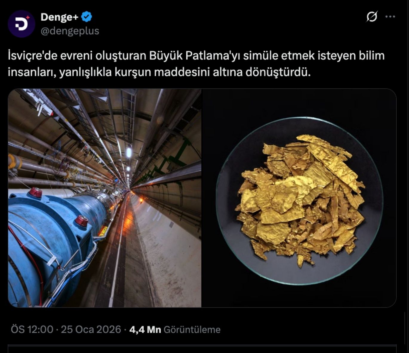 ABD merkezli sosyal medya platformu X'te, "İsviçreli bilim insanları kurşunu altına dönüştürdü" mesajıyla yapılan paylaşım, 4 milyondan fazla görüntülenme alarak kısa sürede gündem oldu.