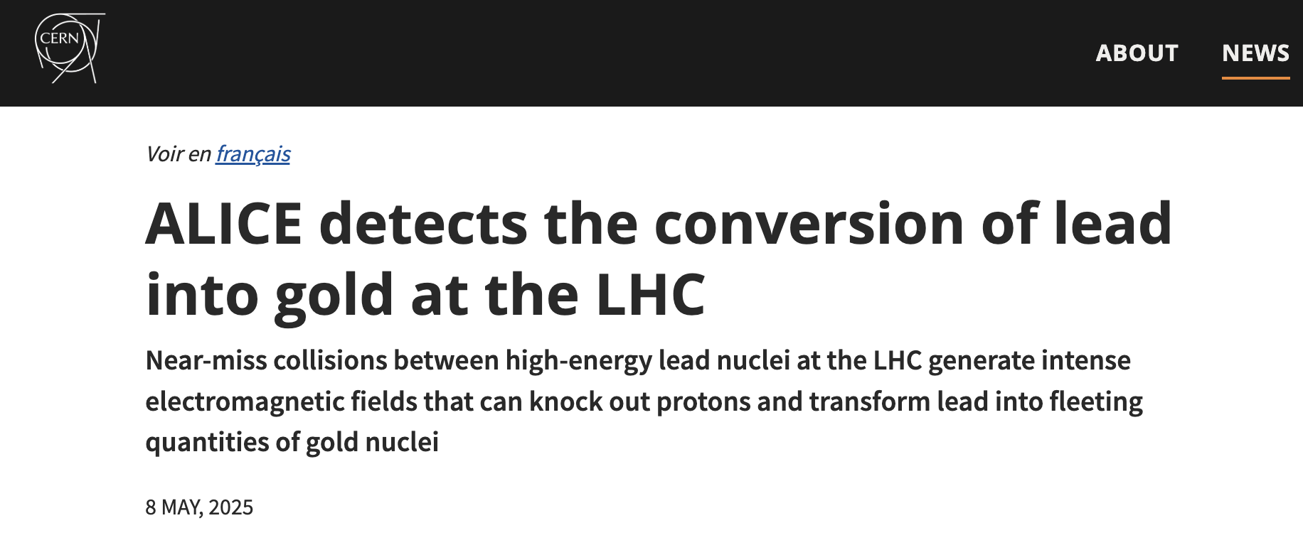 Yayımlanan makaleye göre, CERN'de yürütülen bir deneyde, kurşunun altına dönüştüğü bir fizik süreci ilk kez doğrudan gözlemlendi. CERN'de bulunan Büyük Hadron Çarpıştırıcısı'nda (LHC) yapılan çalışmada, 'ALICE' adlı deney kapsamında kurşun atomları çok yüksek enerjiyle birbirine çarpıştırılmadan, yalnızca birbirlerine çok yaklaştırıldı. Bu yakın geçiş sırasında oluşan aşırı güçlü elektromanyetik alanlar, kurşun atomlarının çekirdeğinden birkaç protonun kopmasına neden oldu.