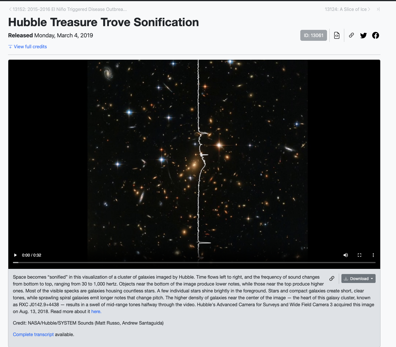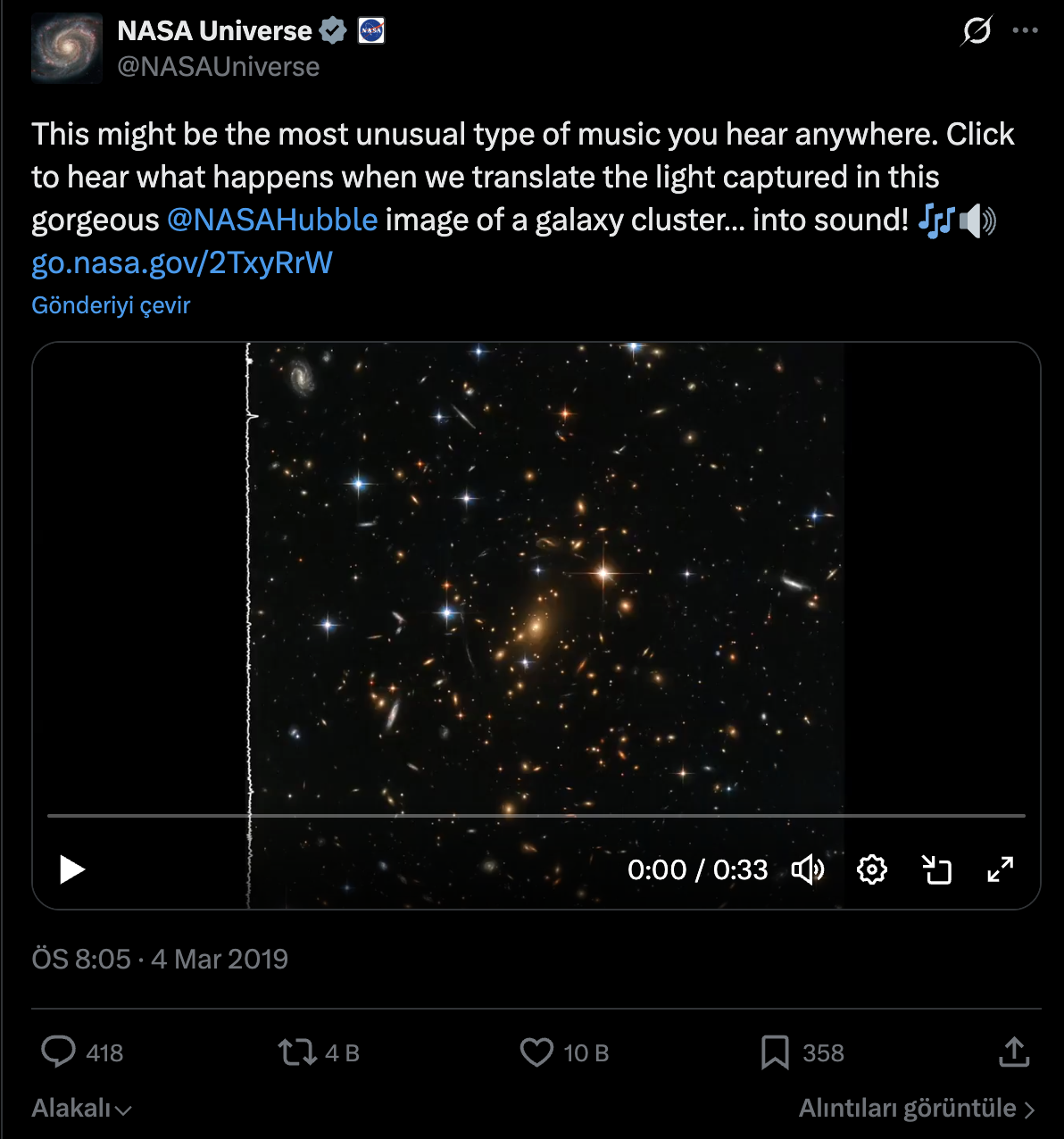 NASA tarafından "Hubble Treasure Trove Sonification" başlığıyla paylaşılan kaydın, Hubble Uzay Teleskobu’nun görüntülediği bir galaksi kümesine ait görsel verilerin sese dönüştürülmesiyle oluşturulduğu belirtildi. Çalışmada uzaydan doğrudan bir ses kaydı alınmadığı, teleskop verilerinin belirli kurallar çerçevesinde “seslendirildiği” ifade edildi.