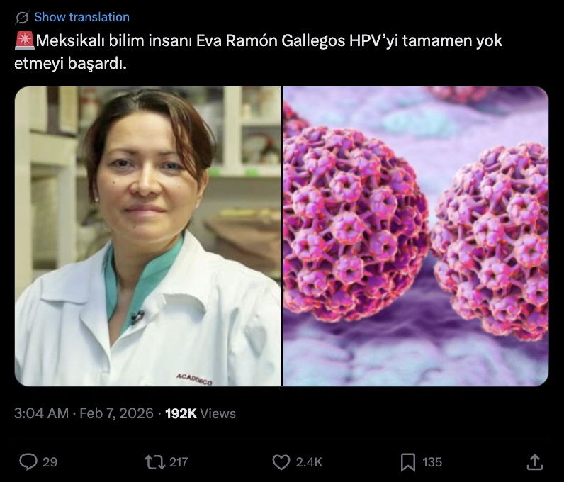 Son günlerde sosyal medyada çeşitli kanser türlerinin kesin tedavisinin bulunduğunu öne süren paylaşımlar yaygınlaştı. Bu furyaya eklenen bir paylaşımda Meksikalı bilim insanı Eva Ramon Gallegos’un HPV’yi tamamen yok etmeyi başardığı iddia edildi.